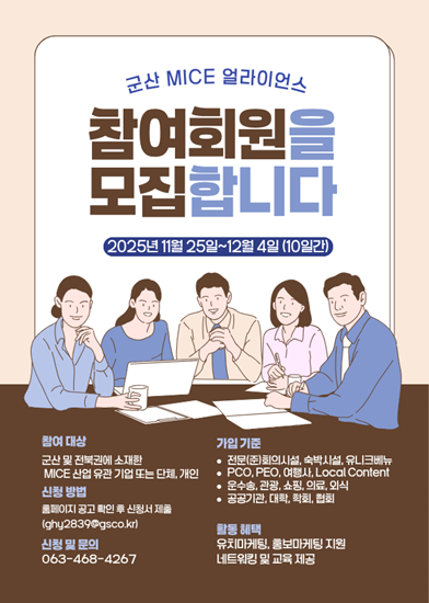 군산시 관계자는 “이번 얼라이언스 모집은 군산 새만금 예비국제회의지구의 성장 가능성을 지역과 함께 확장해 나가기 위한 과정이다”며 “특히 군산 로컬 콘텐츠를 기반으로 활동하는 기업·개인에게도 문호를 열어 지역 MICE 생태계가 더욱 풍성해지기를 기대한다”고 말했다.