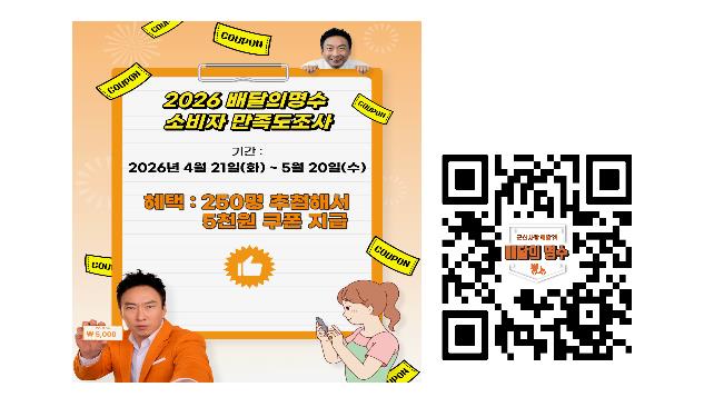 설문 참여자 가운데 총 500명(소비자 250명, 가맹점주 250명)을 대상으로 소비자는 추첨을 통해, 가맹점주는 선착순으로 ‘배달의명수’ 5,000원 할인 쿠폰이 제공된다.