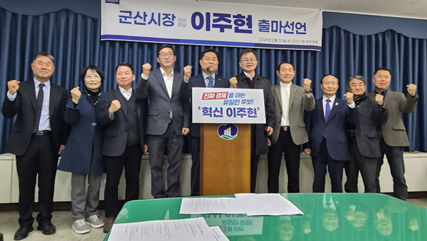 조국혁신당 군산시장 예비후보인 이주현 군산지역위원장(전 전북조달청장)이 25일 군산시장 출마를 공식 선언하며 군산 대전환을 위한 경제·관광·청렴 3대 혁신 비전을 발표했다.