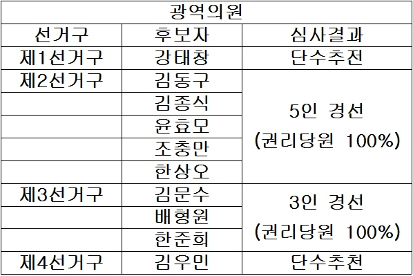 전북도당 공관위 심사 결과 광역의원(도의원) 제1선거구와 제4선거구는 각각 강태창과 김우민을 단수 추천했다.