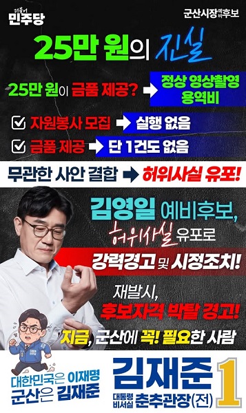 김재준 군산시장 예비후보 선거대책위원회(이하 선대위)는 김영일 예비후보 측이 전혀 무관한 사안을 결합해 불법 금품이 제공된 것처럼 허위사실을 유포했다며, 더불어민주당의 신속하고 엄정한 조치를 촉구했다.