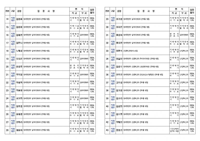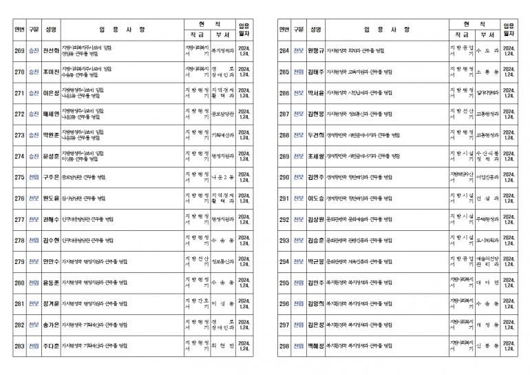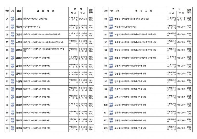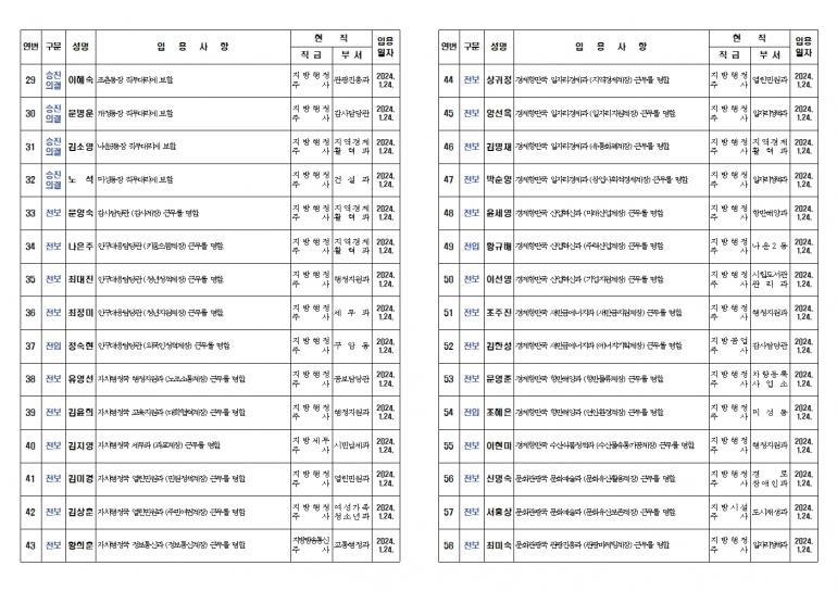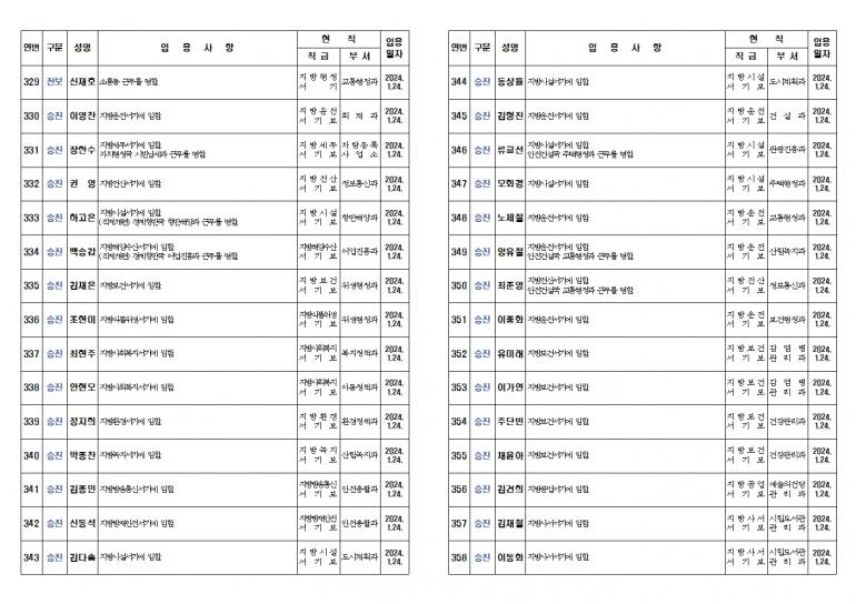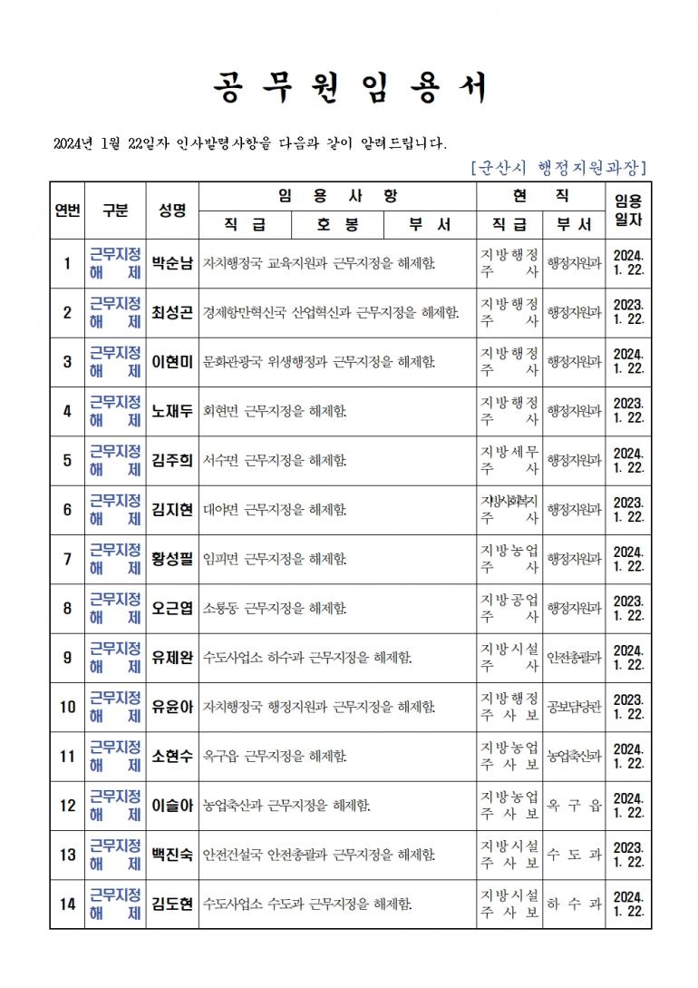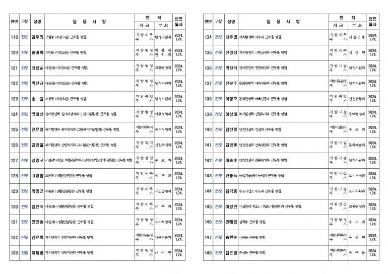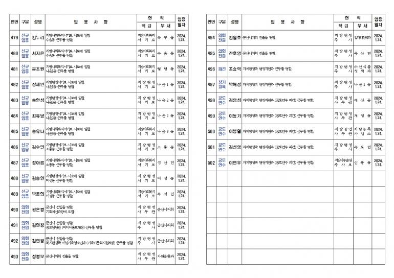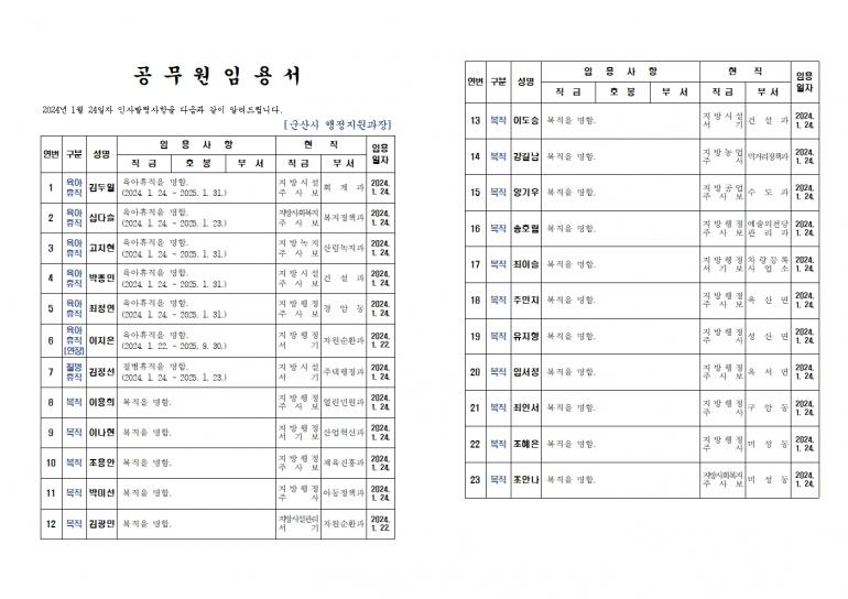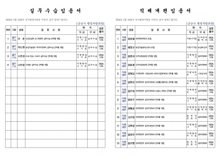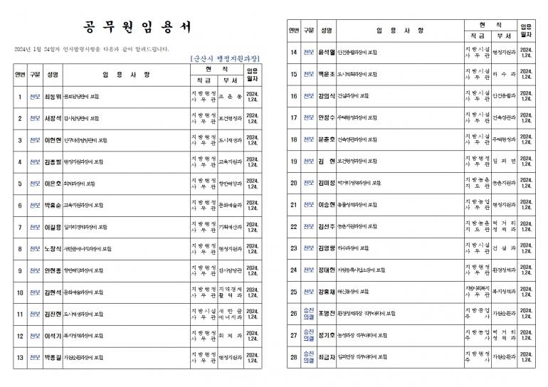 군산시가 오는 24일자로 시행 예정인 2024 상반기 정기인사를 발표했다. 인사명단은 다음과 같다.