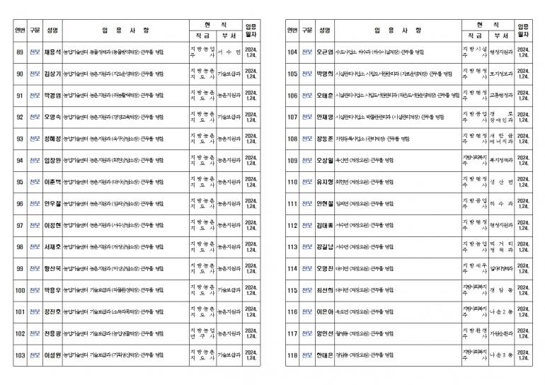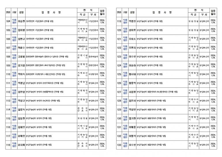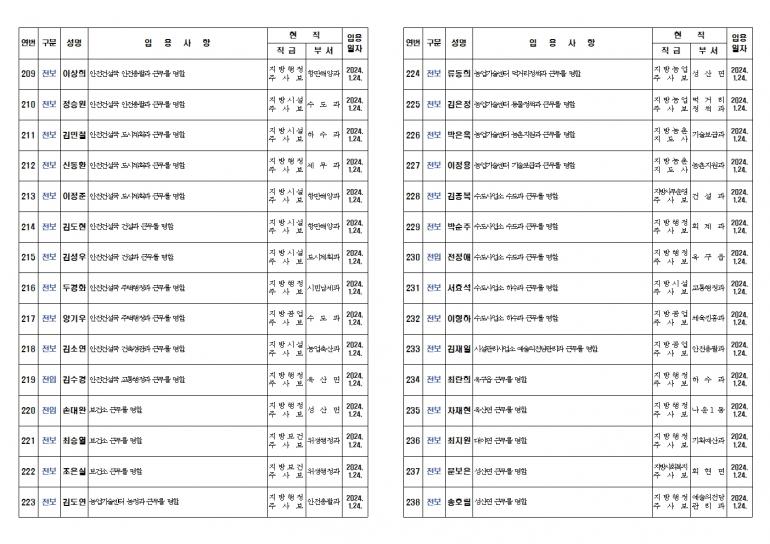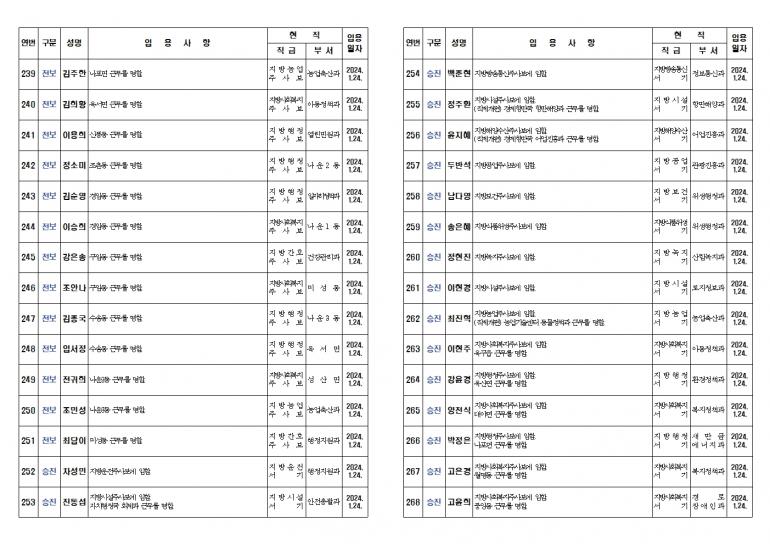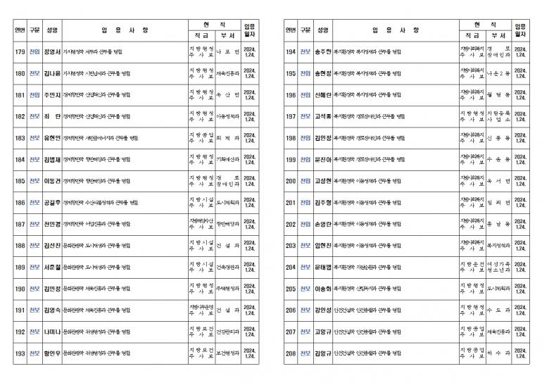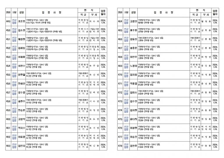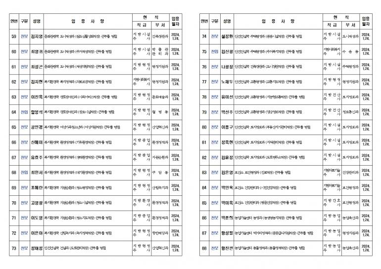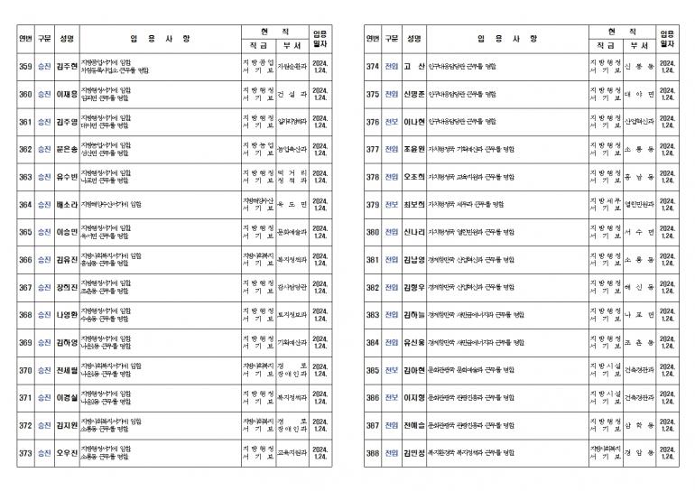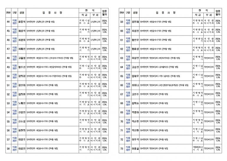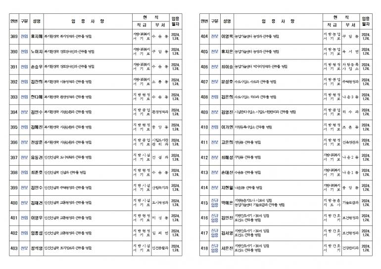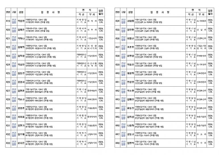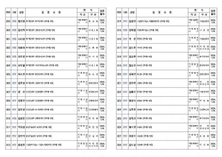 군산시가 오는 24일자로 시행 예정인 2024 상반기 정기인사를 발표했다. 인사명단은 다음과 같다.