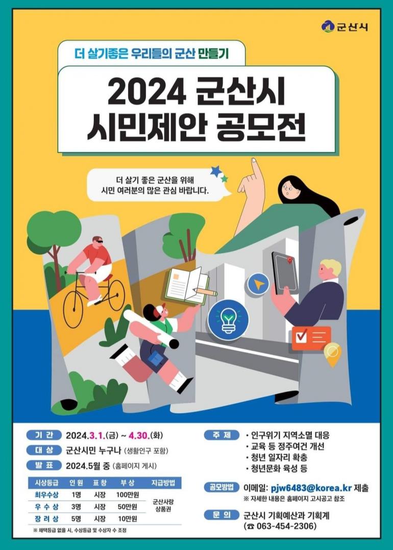 정책의 시민 체감도를 높이고 시민의 시정 참여 확대와 다양한 아이디어 발굴을 위한 ‘2024 군산시 시민 제안 공모전’이 열린다.