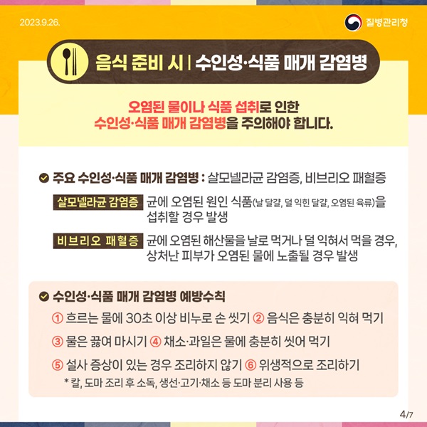 한편 긴 연휴 기간으로 국내․외 여행 이동과 음식 함께 섭취 등으로 집단발생 위험이 증가할 수 있어 수인성․식품매개 감염병 주의도 필요하다.