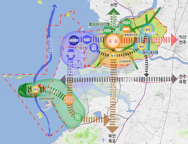 공간구조는 기존 1도심(동지역) 5지역중심(산업단지,옥구,대야,임피,고군산군도)에서 새만금과의 발전 축을 고려해 산업단지 기능을 부도심으로 강화한 1도심(동지역) 1부도심(산업단지) 4지역 중심(옥구,대야,임피,고군산군도) 체제로 개편했다.