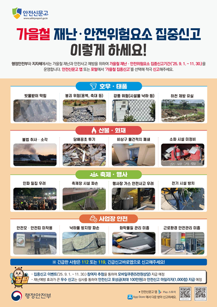 이번 집중 신고는 가을철 빈번하게 발생하는 사고 예방을 위해 추진되며 ▲축제와 행사 ▲호우와 태풍 ▲산불과 화재 ▲사업장 안전 등 네 가지 유형 위험 요소를 대상으로 한다.