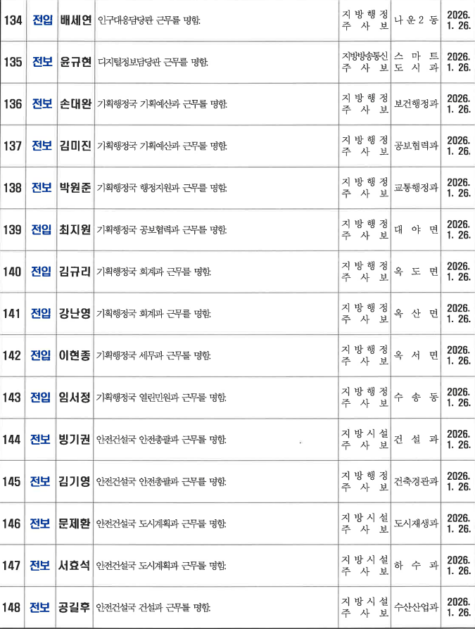 군산시는 23일 오후 1월 26일자 상반기 정기인사 명단을 발표했다.