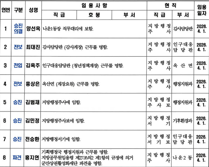 또한, 4명의 직원에 대한 전입과 전보 및 파견 인사가 이뤄졌다.