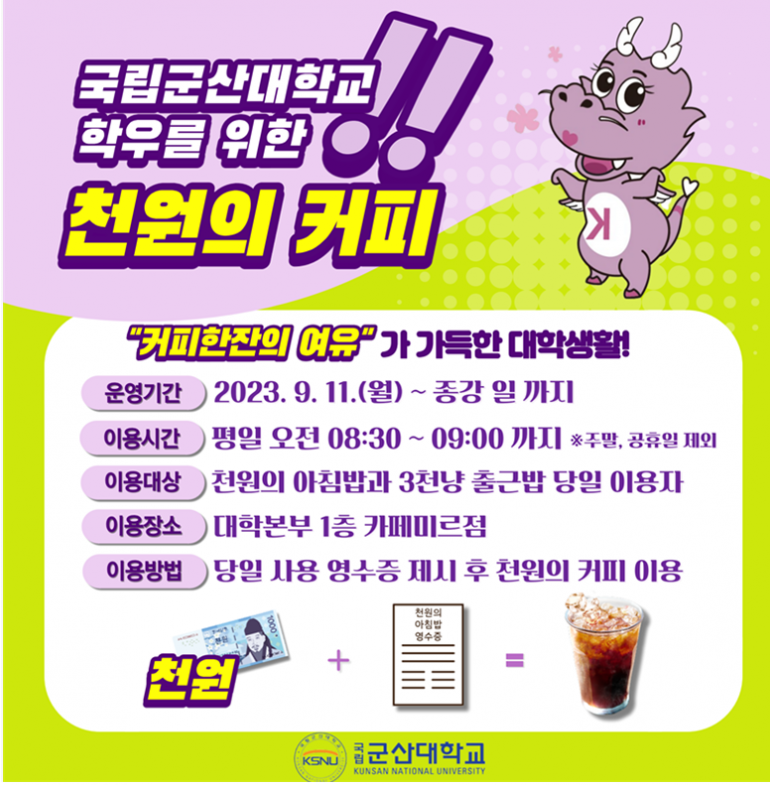 국립군산대학교 소비자생활협동조합에서 운영하는 ‘천원의 커피’ 사업이 학생들의 관심과 호응을 얻고 있다.