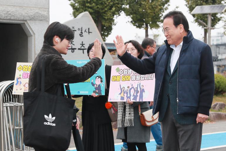 서 교육감은 이날 오전 7시 30분부터 30여 분간 전주 전라고등학교 앞에서 시험을 치르기 위해 학교 안으로 들어가는 수험생들을 맞이하며 ‘마지막까지 최선을 다해달라’고 응원했다.