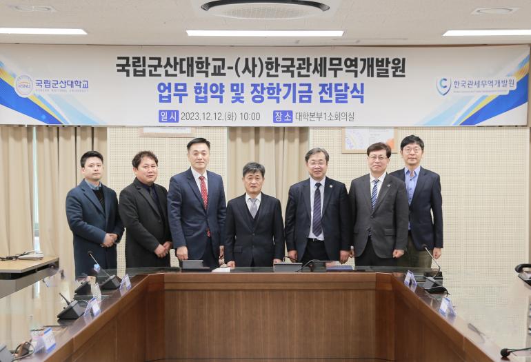 12일 국립군산대와 한국관세무역개발원은 대학본부 4층 제1소회의실에서 업무협약을 체결하고 장학기금 전달삭을 가졌다.