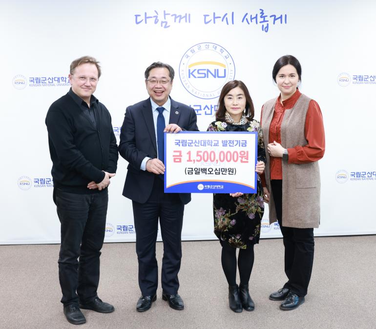 지난 16일 국립군산대 대학본부에서 이장호 국립군산대 총장과 최연성 부총장, 그리고 박규연 K-뮤즈 소사이어티 대표, 코냐힌 알렉산드로 바이올리스트, 스키바 테타냐 비올리스트 등이 참석한 가운데 국립군산대 발전기금 전달식이 개최됐다.