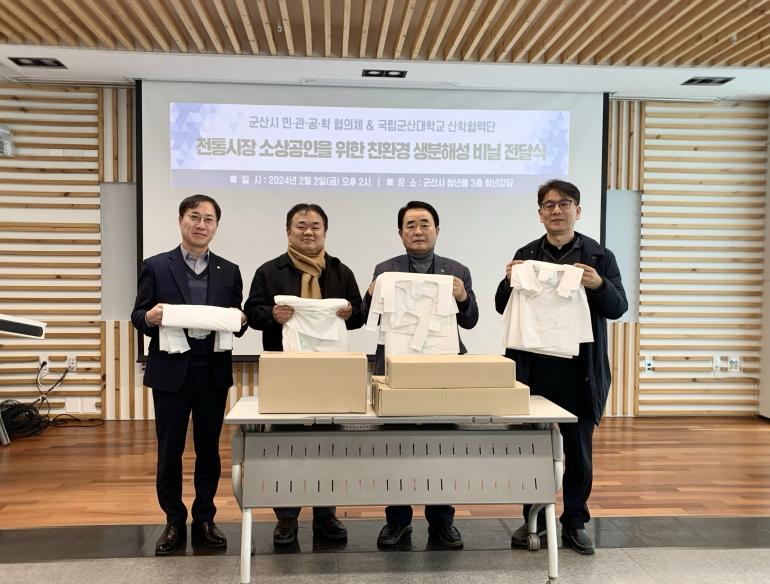 국립군산대는 2022~2023년도에 링크플러스 사업단 등을 통해 전통시장 활성화 지원사업을 운영하며 침체된 전통시장에 활력을 불어넣기 위해 노력했다. 특히 관련 사업이 종료된 후에도 장민석 산학협력단장은 전통시장 소상공인을 위해 친환경 생분해성 비닐을 지원할 방법을 모색해 왔고, 전통시장의 비닐봉지 사용이 늘 것으로 예상하는 설을 앞두고 전달식을 진행했다.