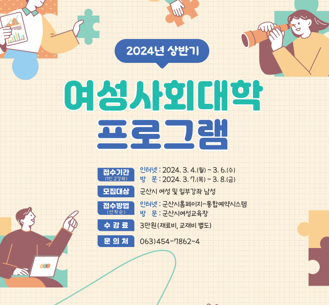 자세한 사항은 군산시청 홈페이지(https://www.gunsan.go.kr/main/m144)를 확인하거나 여성사회대학(454-7862~4)으로 문의하면 된다.