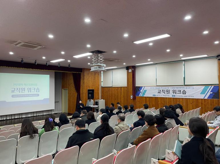 이번 교직원 워크숍에는 대학 구성원 70여 명이 참석했으며, 서주석 위원이 2023년 지방전문대학 활성화 사업의 자체평가 결과 보고를 진행했다.