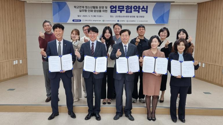 국립군산대 대학일자리플러스센터와 군산중앙여자고등학교, 군산남중학교, 군산중학교, 군산청소년수련관은 지난 11일 청소년수련관 7층 연회장에서 ‘학교연계 청소년 활동 운영 및 실무형 인재 양성’을 위한 협약을 체결했다.