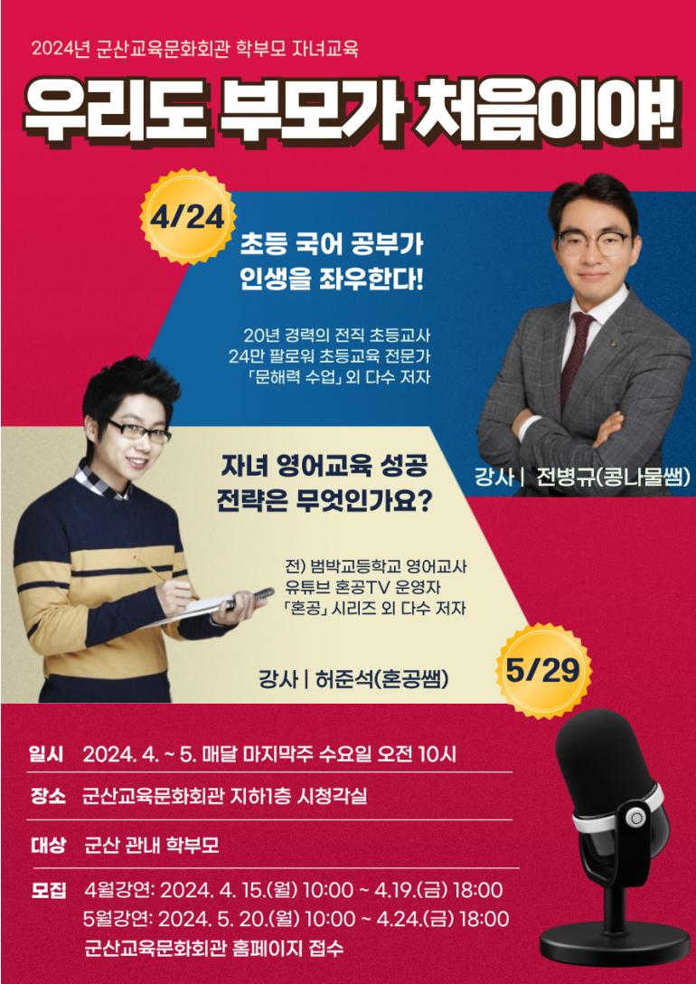 이와 관련해 군산교육문화회관은 2024년 학부모 자녀교육 ‘우리도 부모가 처음이야’ 프로그램을 운영한다.