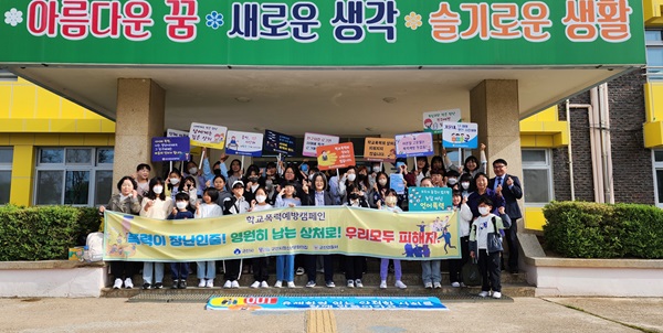 이날 경포초에서 진행된 캠페인에는 손진영 경포초 교장과 생활인성부장, 교육복지사를 비롯해 정훈 군산YMCA 사무총장, 김미옥 액션러닝협동조합 이사장, 경포초 학생자치회, 교육복지 건강천사 동아리, 또래상담동아리 등 50여 명이 참여했다.