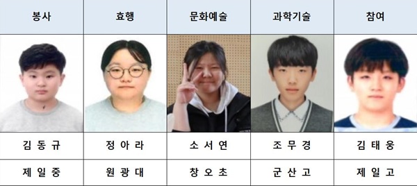부문별로는 ▲봉사부문 제일중학교 김동규 ▲효행부문 정아라 ▲문화예술부문 창오초등학교 소서연 ▲과학기술부문 군산고등학교 조무경 ▲참여부문 제일고등학교 김태웅 학생 등이다.