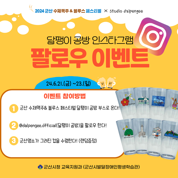 이번 이벤트는 sns를 활용한 인스타그램 팔로우 이벤트로, 발달장애인 아트플랫폼 ‘달팽이 공방’ 인스타그램 계정을 팔로우하면, 발달장애인들이 직접 그린 군산 명소가 담긴 아트컵을 기념품으로 증정한다.