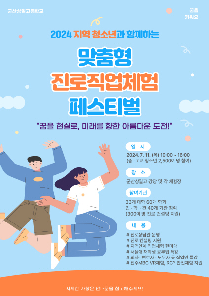 군산상일고등학교(교장 임영근)는 오는 11일 ‘꿈을 현실로, 미래를 향한 아름다운 도전!’을 주제로 지역 청소년과 함께하는 맞춤형 진로·직업체험 페스티벌을 개최한다.