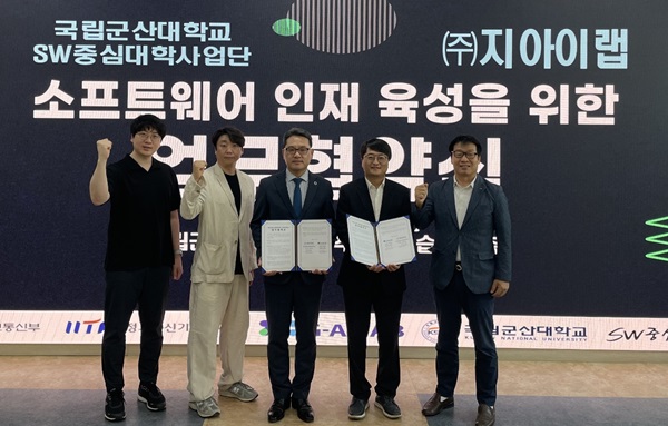국립군산대학교(총장 이장호) SW중심대학사업단(단장 정동원)과 ㈜지아이랩(대표이사 김국세)는 지난 7일 군산대 공학교육실습관에서 산업발전 기반 조성을 위해 업무협약을 체결했다.