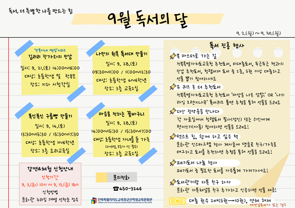 군산학생교육문화관(관장 양서연)은 9월 독서의 달을 맞아 ‘독서, 더 특별한 나를 만드는 힘’을 주제로 다양한 독서문화 프로그램을 운영한다.