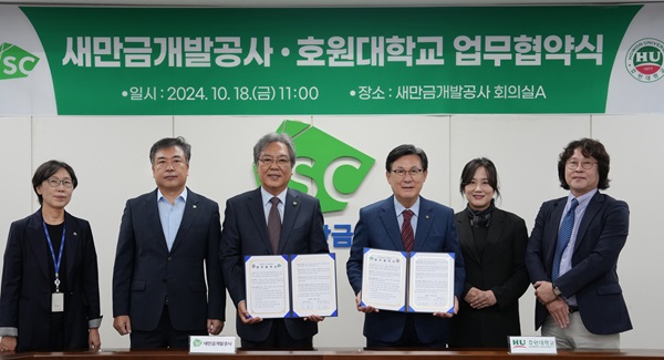 새만금개발공사(사장 나경균⁃이하 공사)는 지난 18일 호원대학교와 새만금의 문화, 관광, 예술 분야 진흥을 위한 상호협력 등을 골자로 한 업무협약을 체결했다.