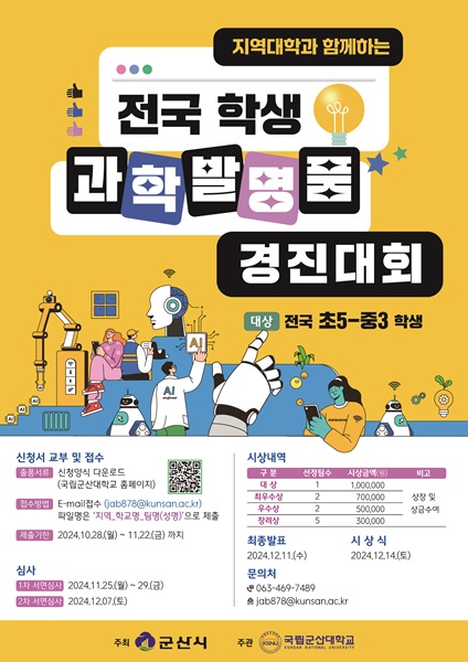 국립군산대학교 공학교육혁신센터(센터장 구본용)는 군산시 주최로 전국에 있는 학생들의 창의적인 아이디어 발굴을 위한 ‘지역대학과 함께하는 전국 학생 발명품 경진대회’를 개최한다.