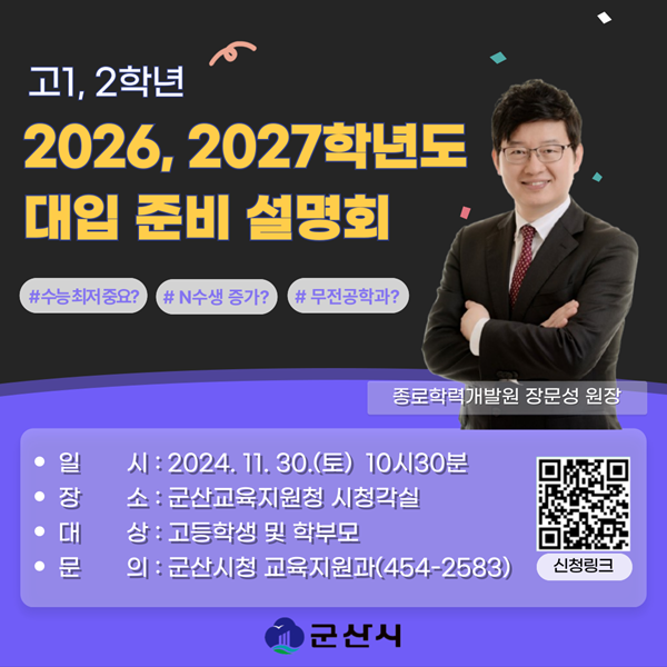 군산시는 오는 30일오전 10시 30분 군산교육지원청 시청각실에서 ‘2026·2027학년도 대입 특강’을 개최한다.