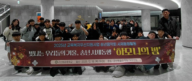 군산영광중학교(교장 이용호)는 지난 18일 사제동행 문화예술 체험활동 ‘빛나는 우리들의 겨울, 하모니의 밤’을 군산예술의전당 대공연장에서 진행했다.