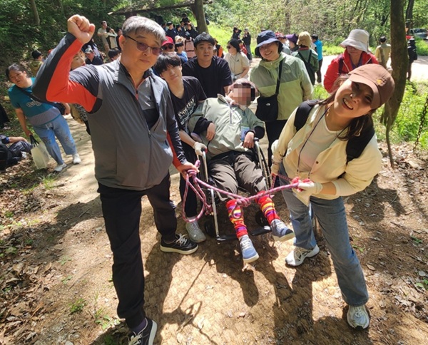 참여 학생들은 휠체어 이용 장애인을 중심으로 5인 1조를 구성해 산행을 지원하고보행이 불편한 장애인과 보폭을 맞춰 동행하며 안전한 이동을 도왔다.