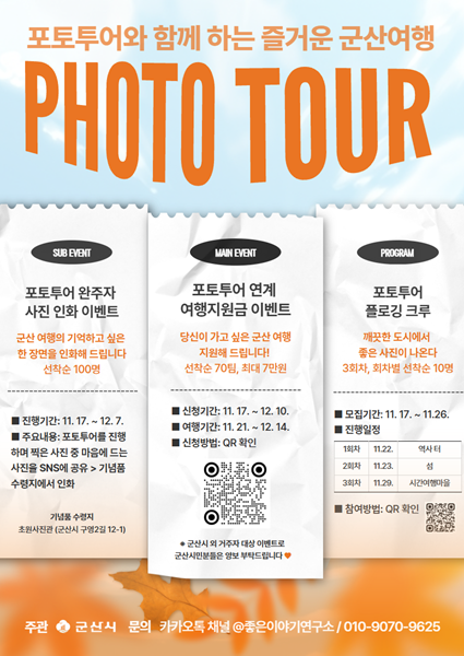 가장 눈길을 끄는 프로그램인 ‘포토투어 연계 여행지원금 지급’은 군산을 여행하는 관광객에게 여행경비 일부를 지원하는 프로그램으로 참여를 희망하는 관광객은 포토투어 코스 중 여행지 10곳을 선정해 SNS에 공유하고 누리집(www.goodstorylab.com/event1)를 통해 신청하면 된다.