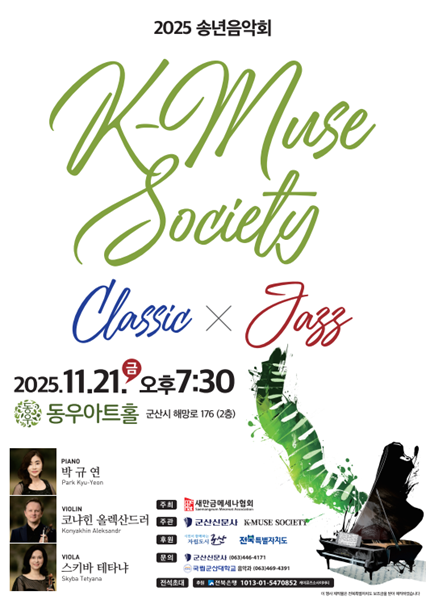 새만금메세나협회가 주최하고 지역 대표 신문사 군산신문사와 실내악단 케이뮤즈 소사이어티가 함께 주관하는 제20회 ‘2025 송년음악회’가 오는 21일 오후 7시 30분 군산 동우아트홀에서 성황리 개최된다.