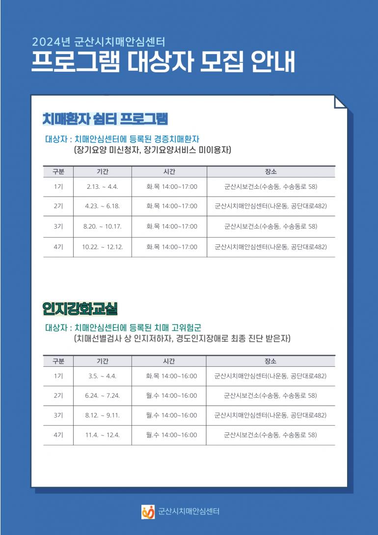 한편 치매 프로그램에 관심이 있는 신청자는 군산치매안심센터(454-5880~4)로 연락하면 되며, 치매 조기 검진 및 치매 치료관리비 등 치매에 관한 기타 문의는 454-5870으로 연락하면 된다.