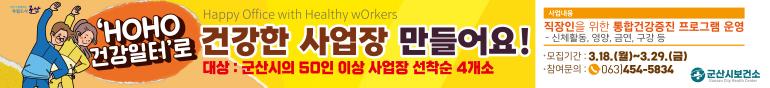 군산시보건소는 3050세대의 주 생활터인 사업장을 대상으로 통합건강증진 프로그램을 운영하는 ‘HOHO 건강일터’ 사업 대상 사업장 모집을 시작한다.