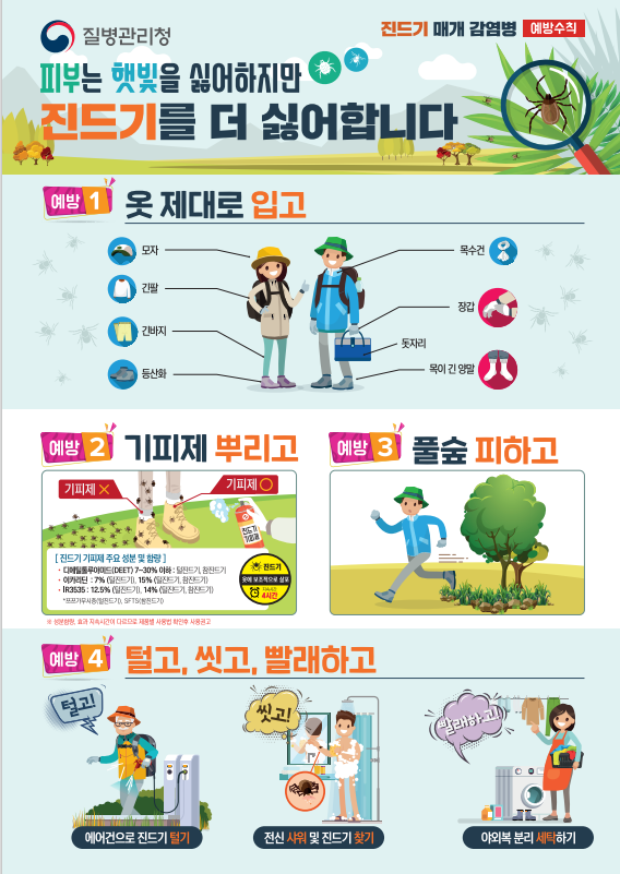 무엇보다 진드기 매개 감염병은 백신과 치료제가 없기 때문에 예방관리 수칙을 잘 지키고 증상이 발현될 경우 즉시 의료기관을 방문하여 야외활동력을 의료인에게 알려 조기진단, 적기 치료를 받아야 한다.