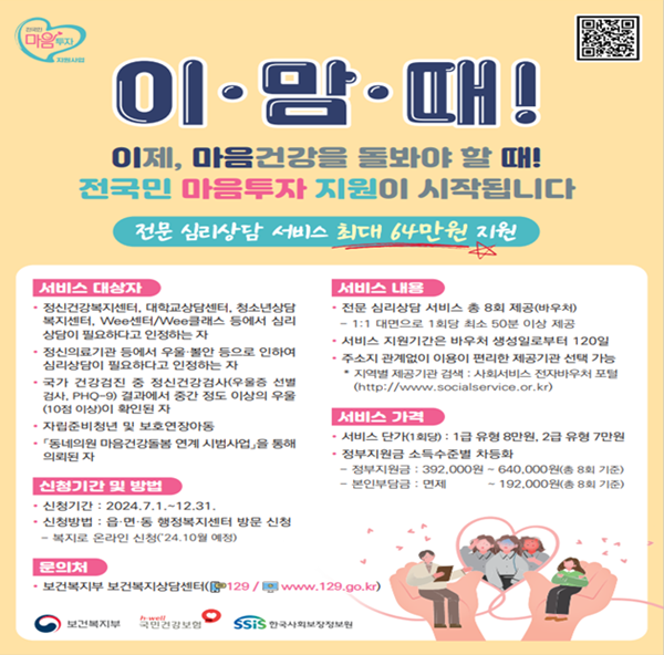 지원 대상은▲정신건강복지센터, 대학교상담센터, 정신의료기관 등에서 심리상담이 필요하다고 인정되는 자 ▲국가 건강검진에서 중간 정도 이상의 우울(우울증 선별검사에서 10점 이상)이 확인된 자 ▲자립준비청년 · 보호연장아동 등이다.