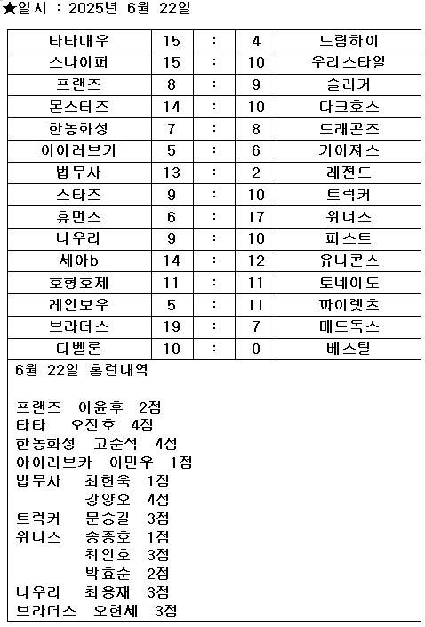 또 위너스는 최인호, 박효순, 송종호까지 홈런 3방을 앞세우며 휴먼스를 17대6으로 이겼다.
