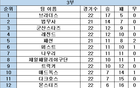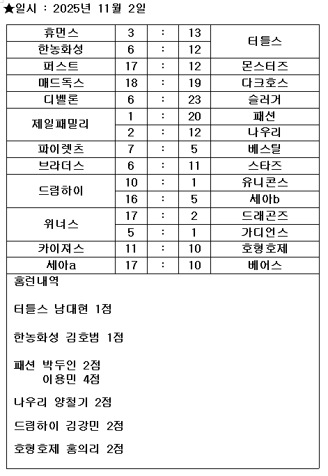 C조 패션은 이용민의 만루 홈런과 박두인의 2점 홈런에 힘입어 제일패밀리를 20대1로 승리했다.