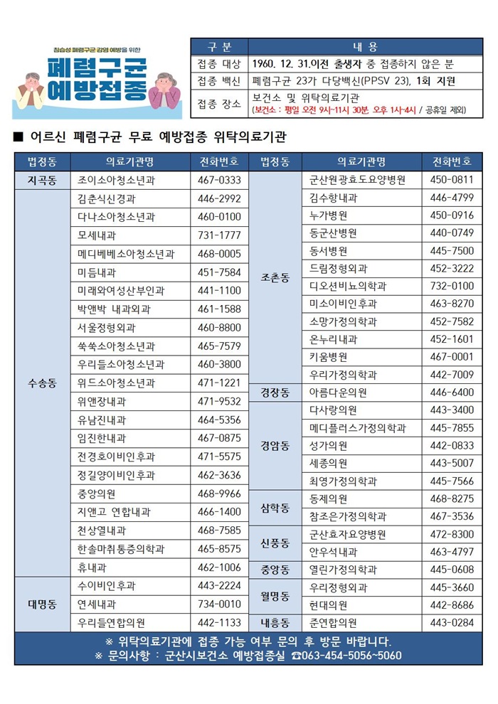 군산시 보건소 관계자는 “1960년생은 12월 접종을, 곧 대상이 되는 1961년생은 새해 첫 접종을 권장한다”며 “폐렴구균 예방접종은 평생 1회만 맞으면 되는 만큼 건강하고 활기찬 노후를 보내길 바란다”고 전했다.