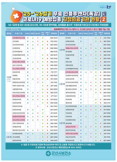한편, 예방접종은 주소지와 관계없이 가까운 위탁 의료기관에서 가능하며 지정 의료기관은 예방접종도우미 누리집(nip.kdca.go.kr)과 군산시보건소 누리집(gunsan.go.kr/health)에서 확인할 수 있다.