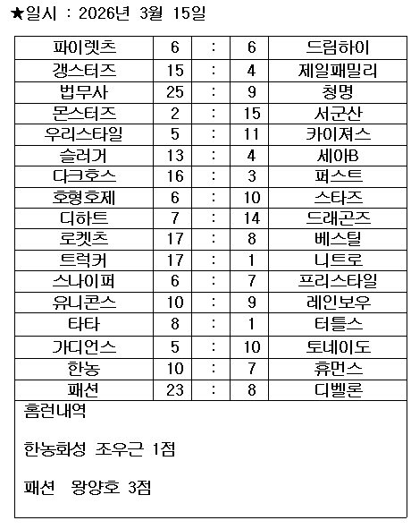 하지만 6회 프리스타일이 3점, 스나이퍼가 2점을 각각 얻으며 프리스타일의 승리로 경기는 마무리됐다.