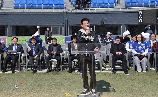 ◇최은성 군산시야구소프트볼협회장이 개막식에서 선수들에게 정정당당한 스포츠맨십을 통해 멋진 승부를 펼치길 당부했다.